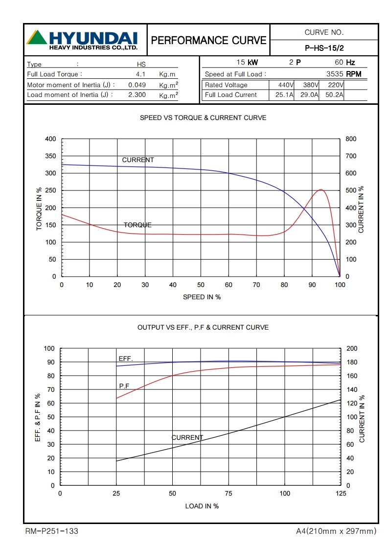 현대모터 삼상유도전동기 20HP 15KW 2P 380V 수평형 B3