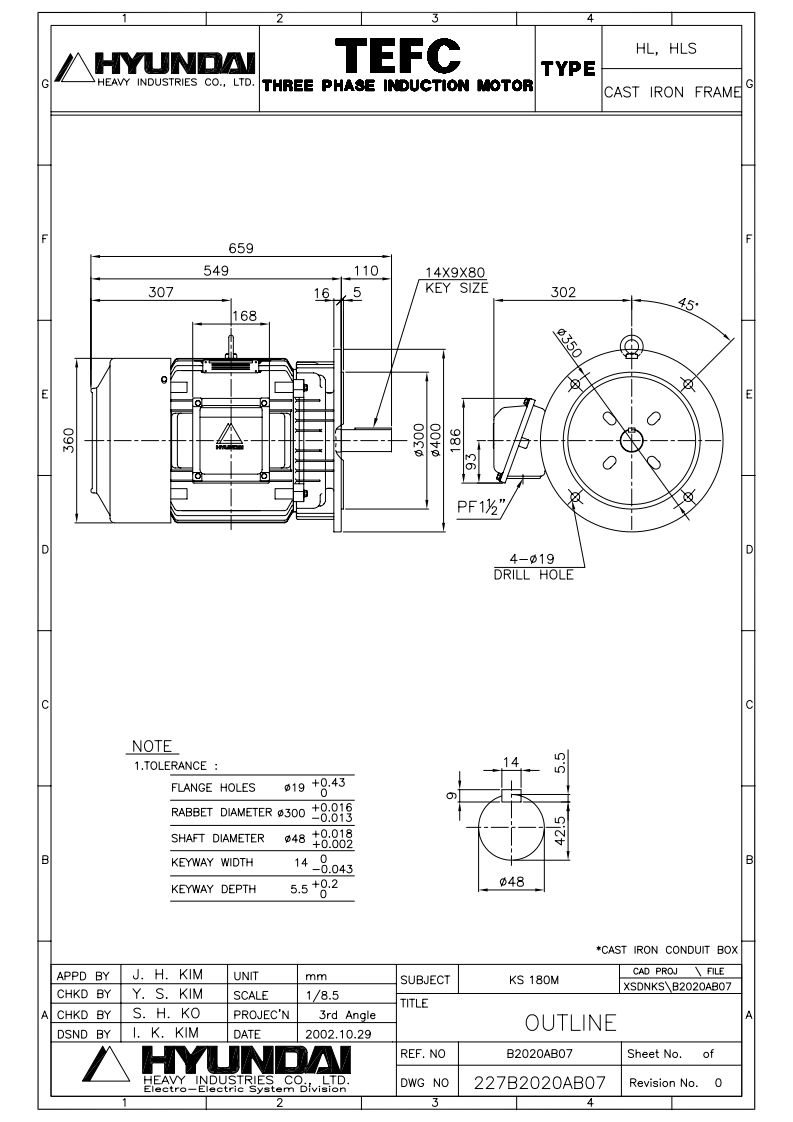 현대모터 삼상유도전동기 20HP 15KW 6P 220/380V 수직형 B5 V1