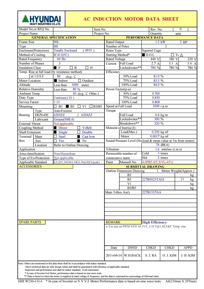 현대모터 삼상유도전동기 2HP 1.5KW 2P 220V 수직형 B5 V1