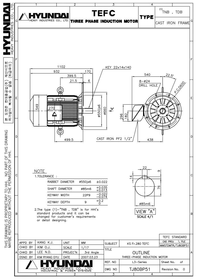 현대모터 삼상유도전동기 150HP 110KW 6P 440V 수직형 B5 V1
