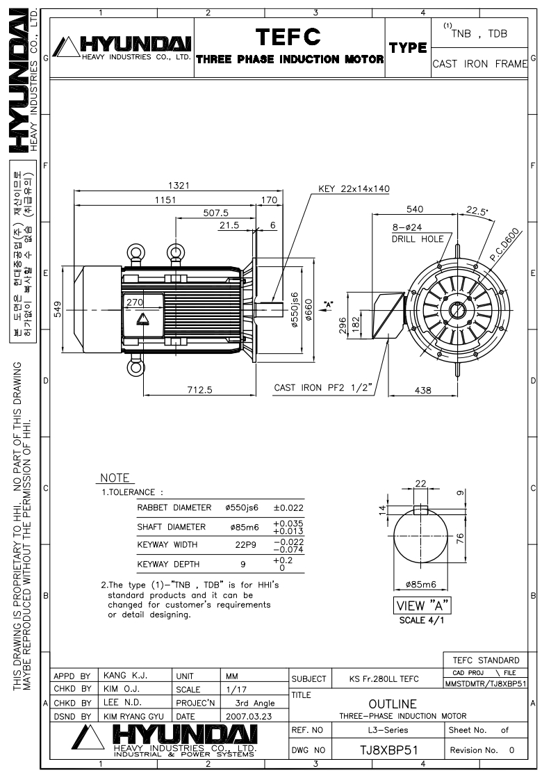 현대모터 삼상유도전동기 150HP 110KW 8P 440V 수직형 B5 V1