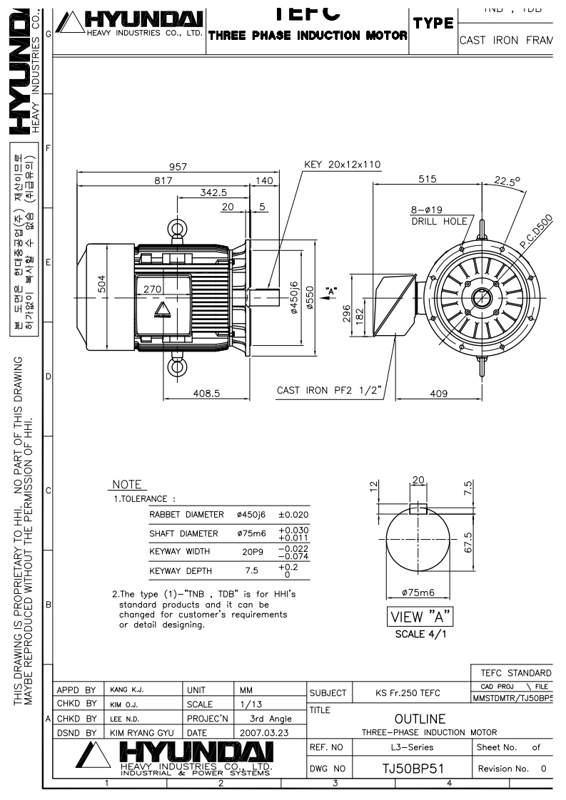 현대모터 삼상유도전동기 100HP 75KW 4P 220V 수직형 B5 V1